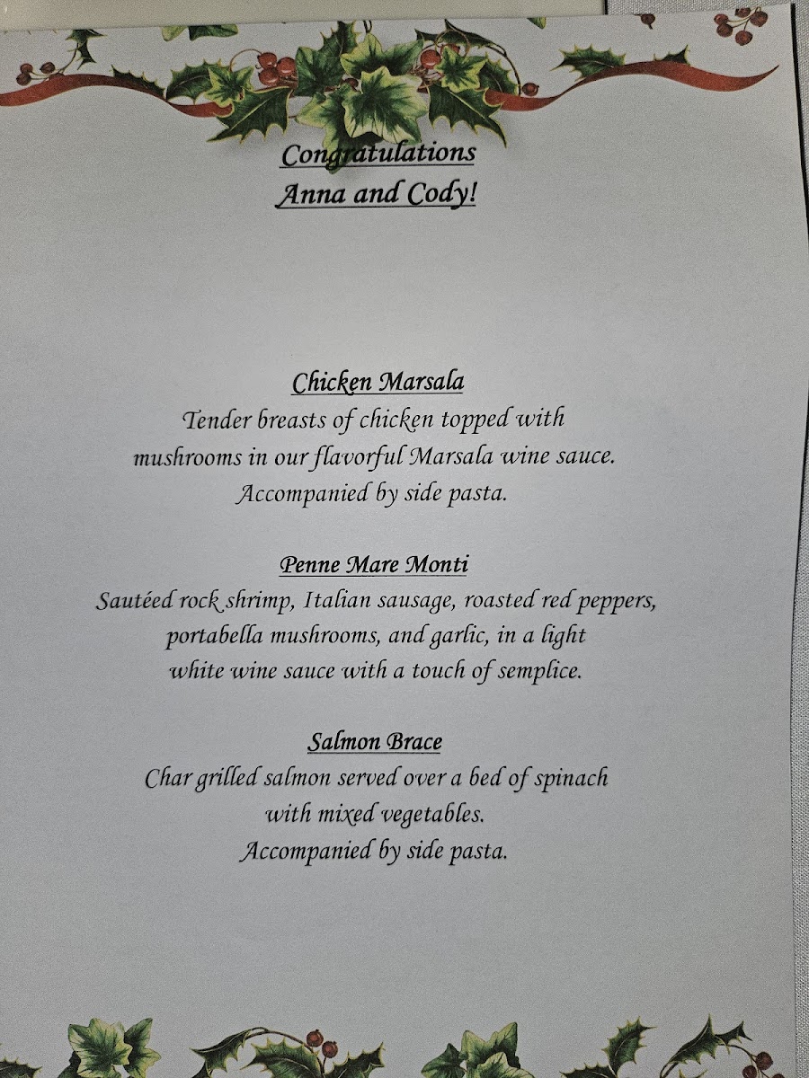 Tender breasts of chicken topped with mushrooms sauteed in your choice of a flavorful Marsala wine sauce or a Piccante white wine sauce and lemon butter sauce.